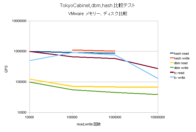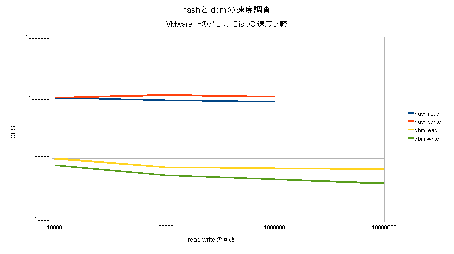 イメージとしては、hashなら、100万qps程度。dbmなら、7-3万qps程度だとイメージしておけば良い(他のdbm TokyoCabinetならもっと早いだろうが、デフォルトのdbmでもこのくらいの速度は出る)。 自宅のVMWare上でのdbm,hashの速度調査 †同様の調査を、VMWare上で行う。 母艦マシンは、iMac(WindowsXPを動かしている)。VMWare Server Ver2,動かしたOSは、ubuntu9.10である。 割り当てたメモリは、512MB,割り当てたCPU数は、1である。